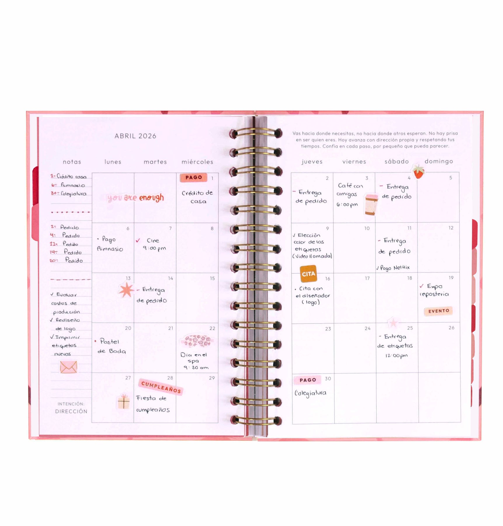 Dile hola a tu especial agenda 2026: Organiza la semana completa, enfócate en lo que realmente importa y dale seguimiento a tus hábitos más valiosos. Cada mes cuenta con calendarios a gran vista, control de finanzas y mucha inspiración. Además, encontrarás secciones de metas, plan de acción, viajes y creatividad en cada hoja.