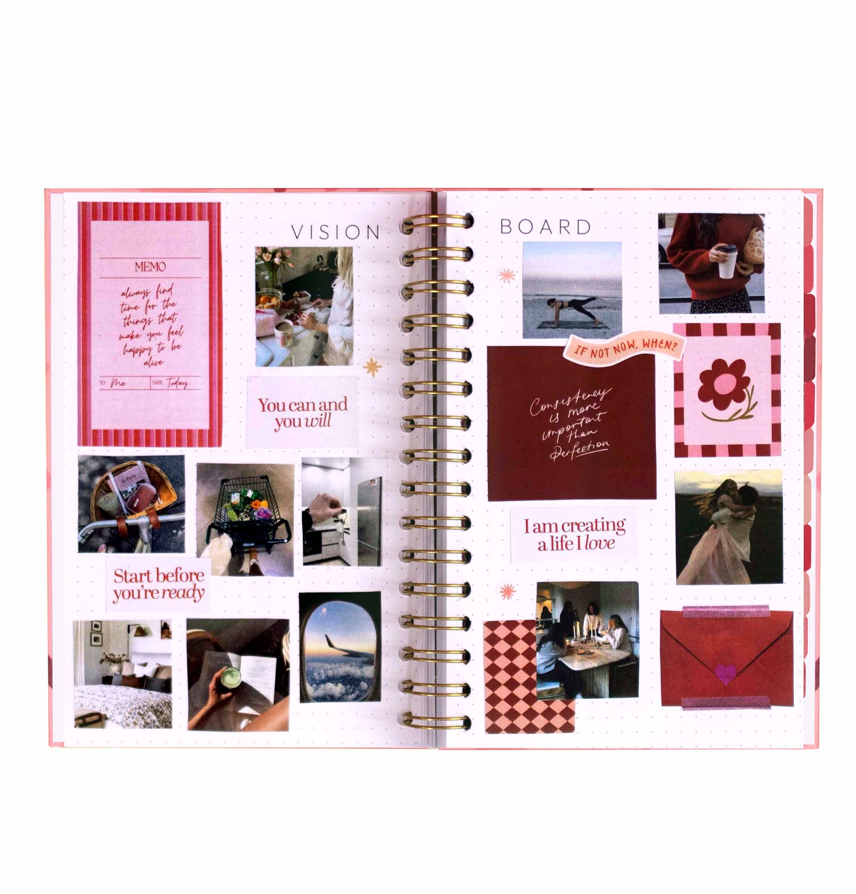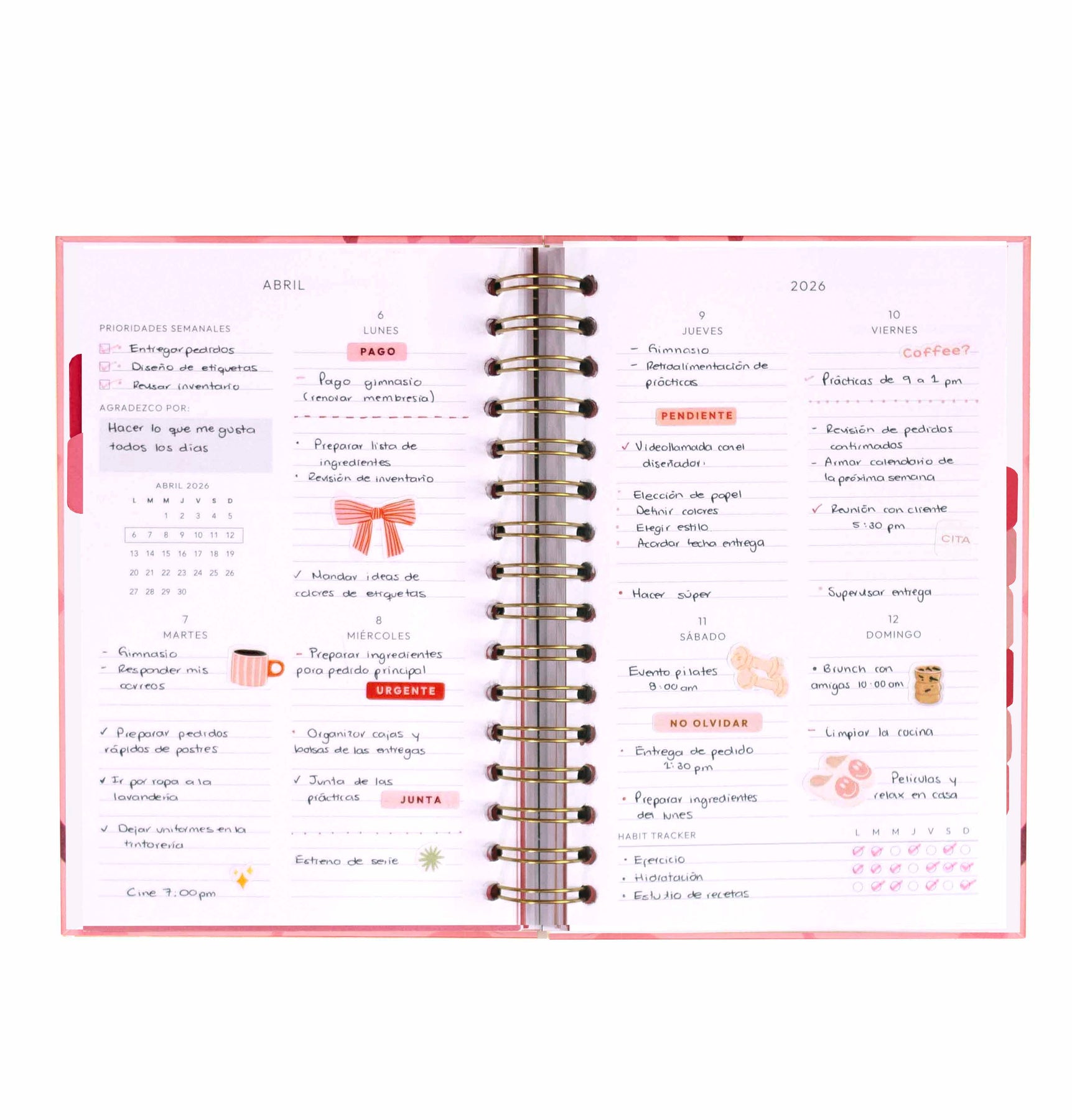 Dile hola a tu especial agenda 2026: Organiza la semana completa, enfócate en lo que realmente importa y dale seguimiento a tus hábitos más valiosos. Cada mes cuenta con calendarios a gran vista, control de finanzas y mucha inspiración. Además, encontrarás secciones de metas, plan de acción, viajes y creatividad en cada hoja.